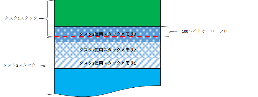 タスク1のスタックの末尾100バイトを書き換えてしまいました。(添付の図を参照願います。)