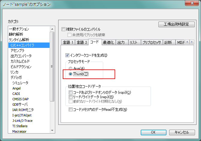C/C++コンパイラのコードオプションにてThumbモードを選択