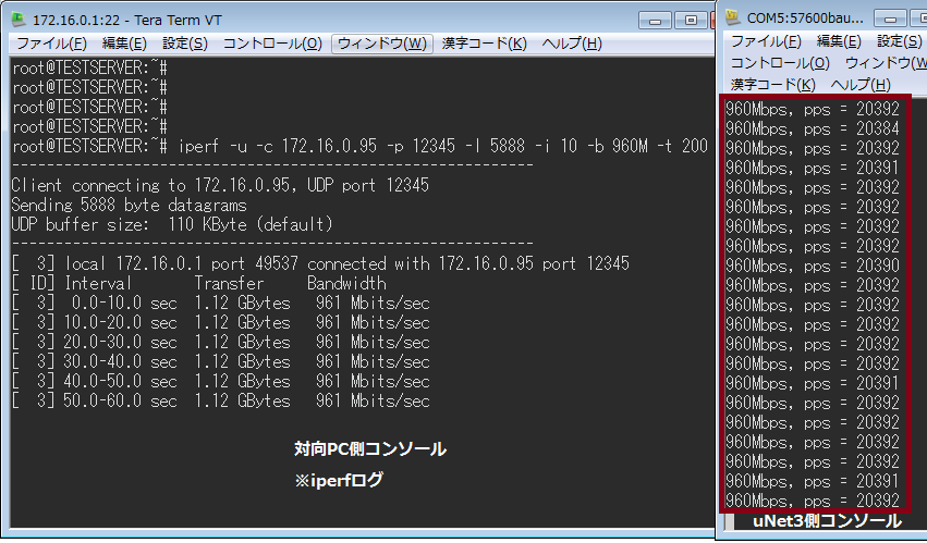 以下を変更してリビルドし実行 計測コマンド:「iperf -c 172.16.0.95 -p 12345 -i 10 -w 64000 -t 200」 ■UDP送信性能